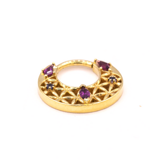 Cosmic Owl hinged ring in yellow gold rhodolite and iolite gems, 16g 5/16"