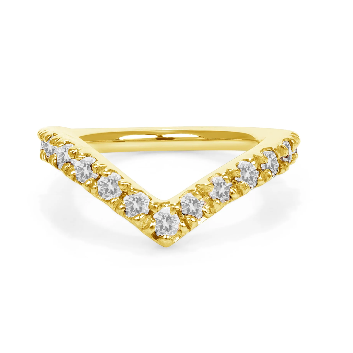 The Vivian seam ring features a downward "V" design with 12-1.5mm CZ gems on a solid 14k yellow gold seam ring. 16g, 7/16" diameter. This would be a great piece for a conch or deeper helix placement!