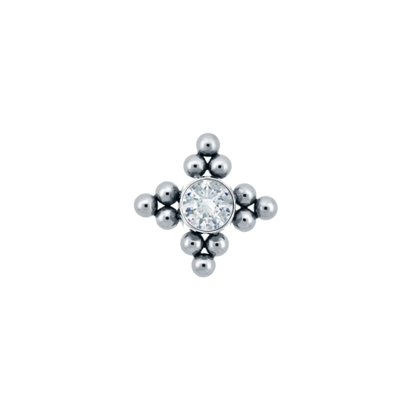 From Leroi, this end from their Haute Couture line features a 2mm bezel set faceted gem with quadruple beaded accents in a titanium setting (ASTM F136). This piece is great for a variety of ear placements, like earlobe, helix, conch, and others!